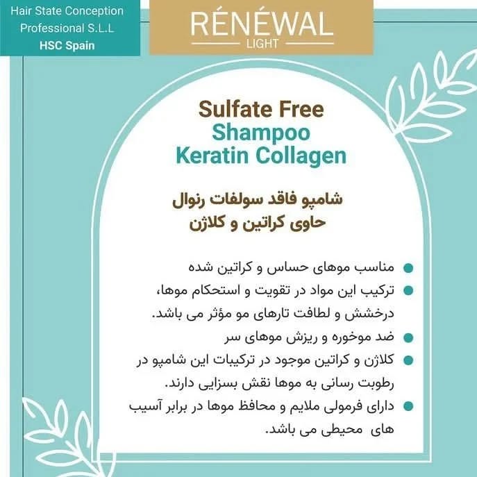 شامپو فری سولفات رنوال حاوی کراتین ساخت اسپانیا مخصوص موهای کراتین شده ضدریزش مو ضدشکنندگی مو ضدموخوره و ضد شوره سر تقویت قوی ساقه مو مخصوص موهای آسیب دیده این شامپو حرف نداره و دارای لیبل اصالت کالا هست