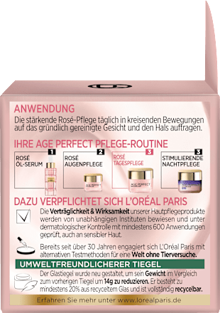 کرم صورت Age Perfect که پوست را زیبا میکند، با ترکیبات ضد پیری خود، به عمق پوست نفوذ کرده و آن را به شدت مرطوب میکند. از همان اولین استفاده، پوست سفتتر شده و شادابتر و درخشانتر به نظر میرسد. پس از چهار هفته، افتادگی پوست کاهش یافته و پوست شما درخشندگی طبیعی و گلگون خود را باز مییابد.