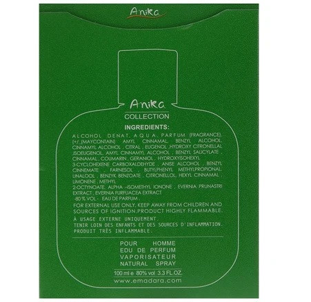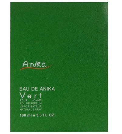 روی شیشه نام Anika به چشم می خورد. در اولین اسپری از ادو پرفیوم مردانه آنیکا مدل Vert حجم 100 میلی لیتر بوی خوشاسطوخودوس، نتهای سبز، گل فریزیا، ریحان، نعناع و مریمگلی به مشام می رسد که باعث ایجاد انرژی مثبت در شما خواهد شد. درخت گل ابریشم، گل زنبق، بنفشه و فریزیا نت های میانی این ادو پرفیوم را تشکیل می دهند. با گذشت زمان نت های پایانی از راه می رسند و عطر خوش کومارین، عنبر، گیاه پاتچولی، اوکموس، علف وتیور و چوب سدر در فضا پخش خواهد شد.